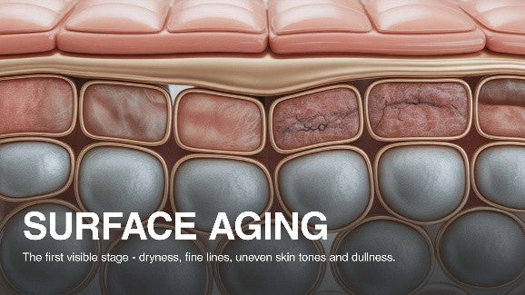 Fine lines, dryness, dullness, and uneven tone emerge as epidermal turnover slows and barrier function weakens. Thinning of the epidermis reduces moisture retention and repair efficiency.